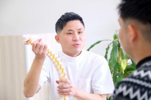 検査をしてみると、左肩が前に出て巻き肩といわれる状態でした。楽器を持つ際に左肩が前になりやすい